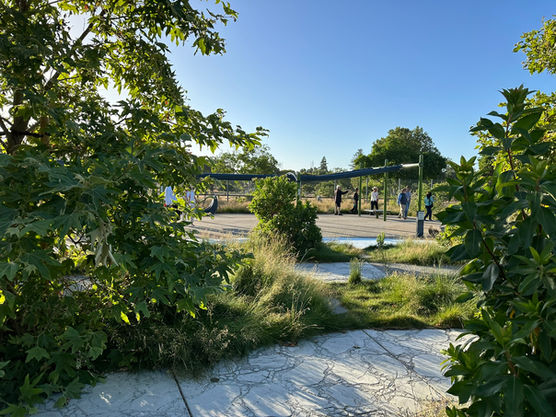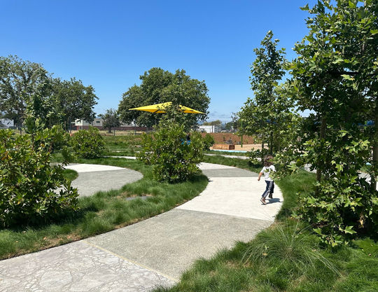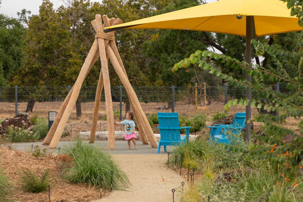 Located near a San Francisco Bay tributary and beneath airport flight patterns, the 5-acre PlayGarden draws design inspiration from the nearby estuary environment, incorporating themes of flowing grasslands, moving water, and wildlife navigating through aquatic and aerial spaces. The fluid, open-ended character of this natural setting reflects the design's goals of encouraging movement and conveying the sense of limitless potential found in expansive views, water elements, and flight. The park's ongoing impact includes employing and training individuals with disabilities as maintenance staff. Both the Santa Clara County Office of Education and San Andreas Regional Center continue to provide programming support for their clients at the facility.